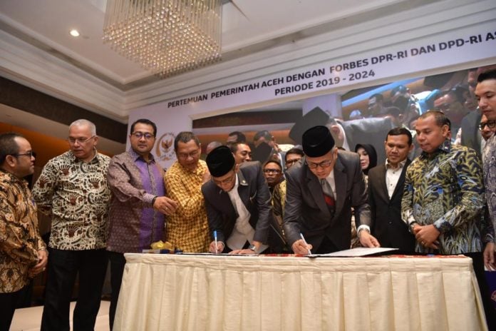Analisaaceh.com, JAKARTA | Plt Gubernur Aceh Ir. Nova Iriansyah, MT dan Ketua DPRA H. Dahlan Jamaluddin, SIP, yang bertindak atas nama Pemerintahan Aceh, menandatangani Memorandum of Understanding (MoU) Pembangunan dan Penguatan Otonomi Khusus, Keistimewaan Aceh, dan Sinergisitas Pemerintahan Aceh dengan Pemerintahan RI, dengan Ketua Forum Bersama (Forbes) DPR RI dan DPD RI asal Aceh, H Muhammad Nasir Djamil, Sag, M.Si, di Hotel Borobudur, Jakarta, Senin (11/11).