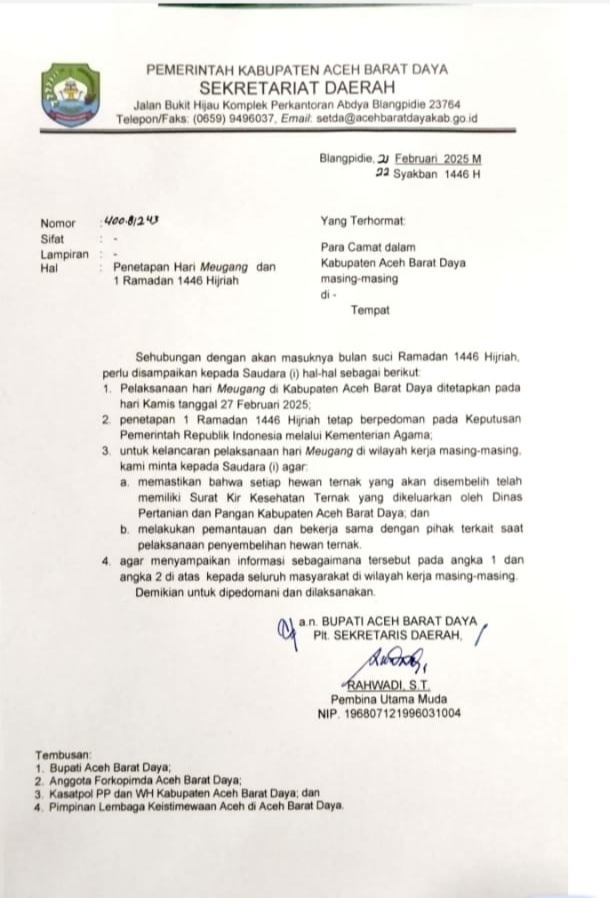 Penetapan hari meugang ini sesuai dengan Surat Edaran (SE) Pemkab Abdya Nomor: 400/8/243 dengan Perihal Penetapan Hari Meugang dan 1 Ramadhan 1446 H.