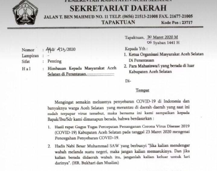 Dalam surat tersebut Pemkab Aceh Selatan meminta warganya di perantauan baik mahasiswa atau pun pelajar yang berada di daerah zona yang ter papar Covid-19 untuk menunda terlebih dahulu pulang kampung sampai dievaluasi oleh Pemkab setempat.