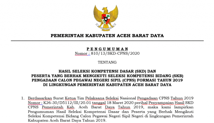 Adapun nama-nama perserta yang lulus dan dapat mengikuti SKB CPNS di lingkungan Pemkab Abdya yaitu: