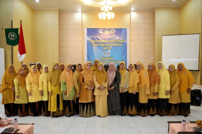 Analisaaceh.com, Aceh Besar | Ketua Dewan Pimpinan Daerah (DPD) Gabungan Organisasi Penyelenggara Taman Kanak-Kanak Indonesia (GOPTKI) Aceh, Safrida Yuliani, mengukuhkan Pengurus dan Ketua DPD GOPTKI Kabupaten Aceh Besar di aula Balai Pengembangan Pendidikan Anak Usia Dini (PAUD) Lubuk, Aceh Besar, Kamis (21/11/2019)