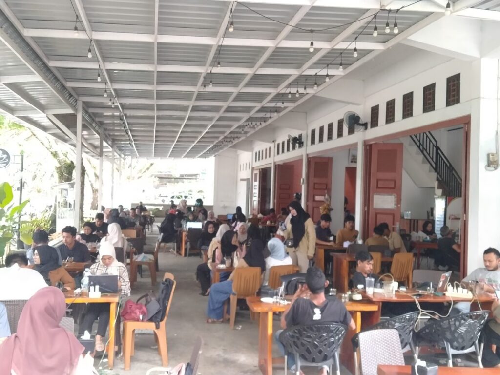 Pengunjung penuhi warung kopi (warkop) SH Kupi di jalan dua jalur menuju kompleks perkantoran, di Gampong Keude Paya, Kecamatan Blangpidie Kabupaten setempat. Foto:Ahlul Zikri/Analisaaceh.com