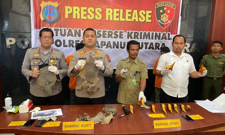 Analisaaceh.com | Satuan Reserse Kriminal Polres Tapanuli Utara, Sumatera Utara mengamankan dua pelaku jual beli satwa dilindungi berupa sisik Trenggiling dan paruh burung Rangkong Gading dari dua lokasi berbeda di Kecamatan Tarutung, Tapanuli.