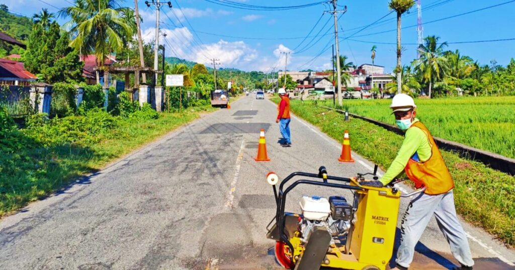 Balai Pelaksanaan Jalan Nasional (BPJN) 1 Aceh melalui Pejabat Pembuat Komitmen (PPK) 2.3 melakukan perbaikan jalan nasional yang menghubungkan Kabupaten Nagan Raya hingga Kabupaten Aceh Barat Daya (Abdya). Foto: Ist