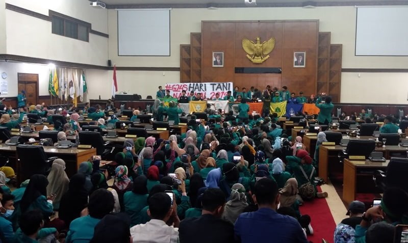 Analisaaceh.com, Banda Aceh | Dalam memperingati hari tani nasional, ratusan mahasiswa dari Badan Eksekutif Mahasiswa (BEM) Fakultas Pertanian Universitas Syiah Kuala (Unsyiah) menggelar aksi di Gedung DPR Aceh, Selasa (24/9/2019).