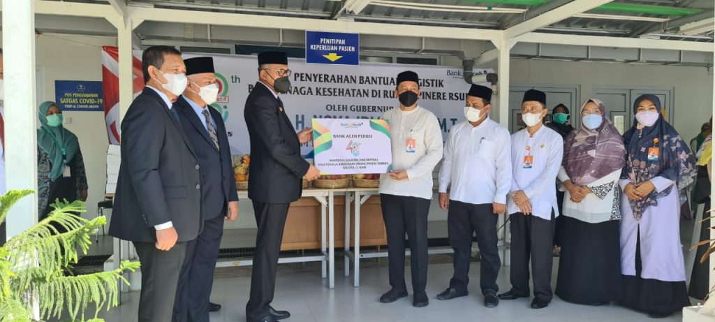 Gubernur Aceh Ir. Nova Iriansyah, MT didampingi Sekda Aceh dr. Taqwallah, M.Kes dan Direktur PT.BAS Haizir Sulaiman menyerahkan bantuan logistik untuk Tenaga Kesehatan yang bertugas di Ruang Pinere RSUDZA yang diterima langsung oleh Direktur RSUDZA, dr.Isra Firmansyah Sp.A di RSUDZA, Banda Aceh, Jum'at (6/8/2021).