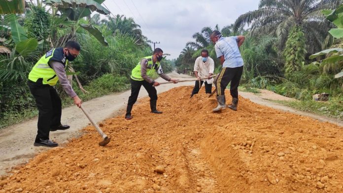 Analisaaceh.com, Banda Aceh | Bersamaan dengan pelaksanaan operasi patuh seulawah 2020, Personel Satlantas Polres Aceh Timur memperbaiki jalan berlobang bersama masyarakat setempat, Selasa (28/7/2020).