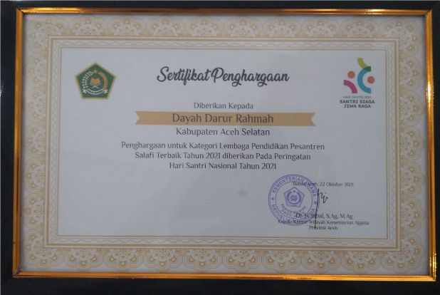 Penyerahan penghargaan itu dilakukan secara simbolis oleh Kepala Kantor Kementerian Agama Kabupaten Aceh Selatan dan diterima oleh Sekretaris dan tim Pesantren Darurrahmah pada Senin (25/10/2021).