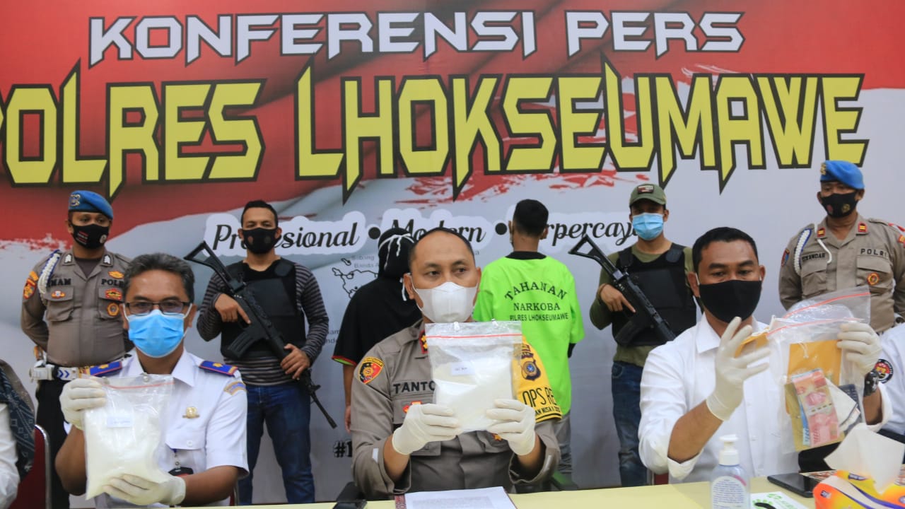 Kapolres mengatakan petugas Bandara Malikussaleh menangkap kedua pelaku pada pesawat penerbangan maskapai Lion Air Grup tujuan Jakarta dan transit di Bandara Kuala Namu, Sumatera Utara. Eko menyebut penggagalan penyelundupan sabu ini atas kejelian petugas bandara.