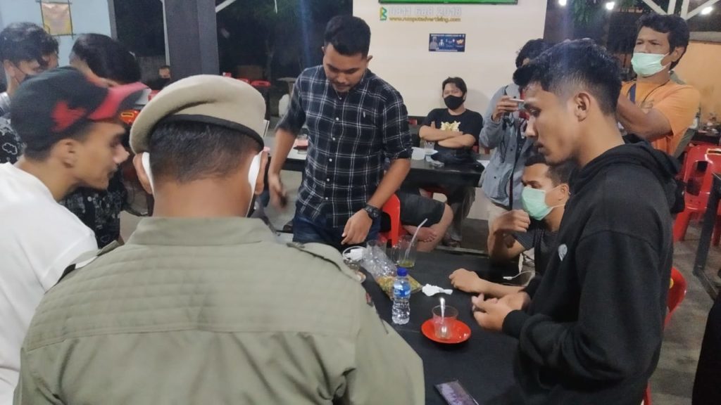 Analisaaceh.com, Banda Aceh | Petugas gabungan yang terdiri dari personel TNI/POLRI, Satpol PP dan WH serta Dinas Perhubungan Kota Banda Aceh, malakukan razia wajib penggunaan masker di warung kopi yang ada di kawasan Banda Aceh, Sabtu (16/5/2020).