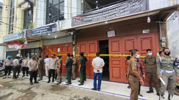 Analisaaceh.com, Banda Aceh | Petugas gabungan menyegel Kafe New Soho, Peunayong, Kota Banda Aceh yang melakukan live musik pada Rabu (21/4) malam.