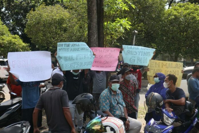 Analisaaceh.com, Banda Aceh | Serikat Pekerja Grand Nanggroe Hotel (SP. GNH) melakukan aksi unjuk rasa di depan Hotel Grand Nanggroe, Lueng Bata, Kota Banda Aceh pada Senin (25/4/2022).