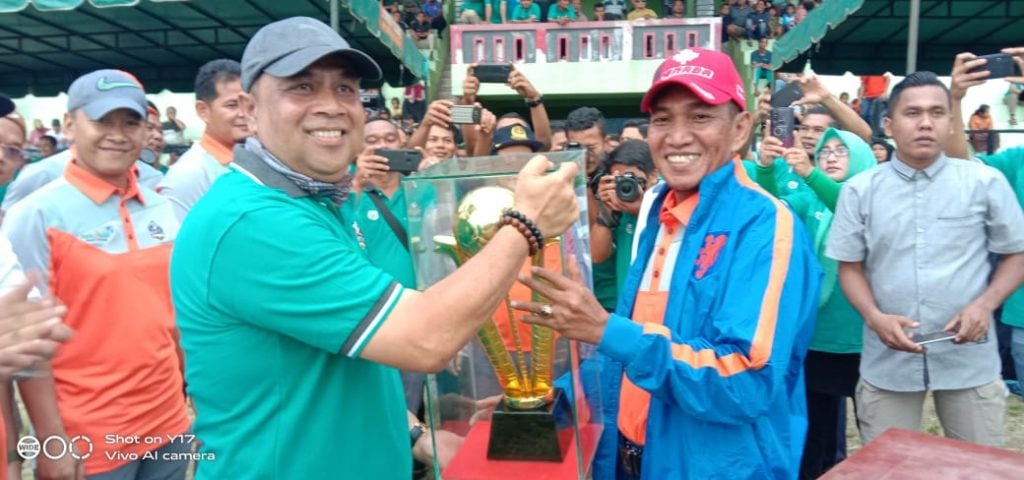 Bupati Aceh Tenggara Raidin Pinim ( kanan) saat menyerahkan Piala bergilir kepada ketua panitia untuk di perebutkan (Foto/BK)