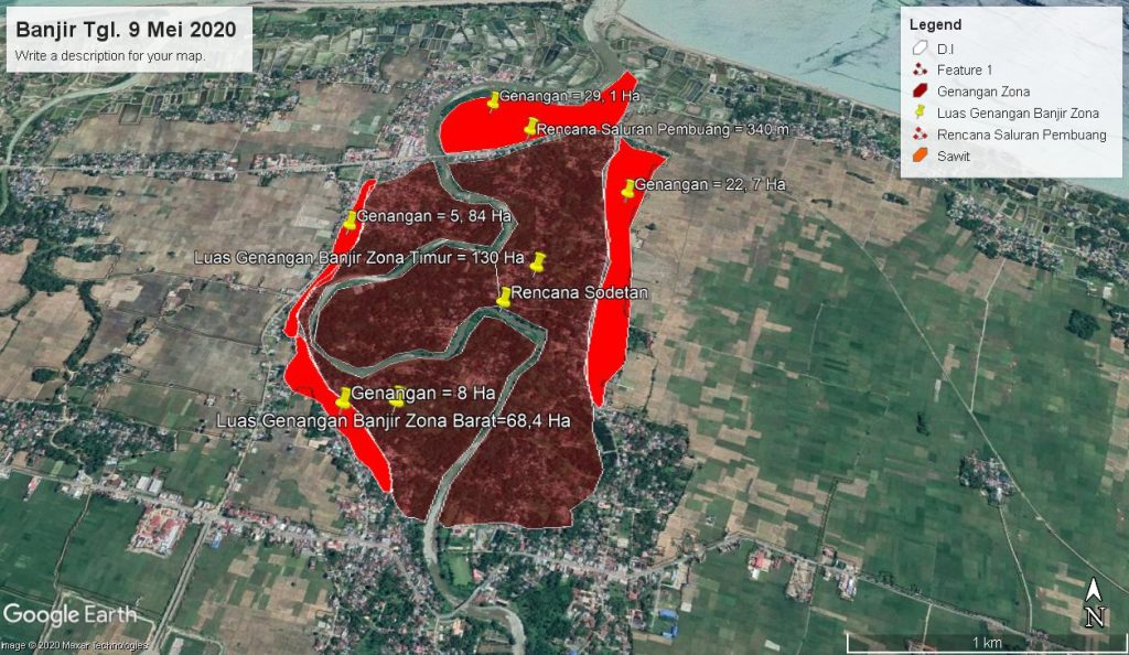 “Dari jam 17.00 – 21.00 WIB luasan-nya terdampak sekitar 250 Ha ditambah lagi sekitar jam 21.00 – jam 10.00 WIB bertambah sekitar 50 Ha dengan ketinggian air variasi berkisar 1.00-2.00 meter,” ucap Amir pada Minggu (10/5/2020).