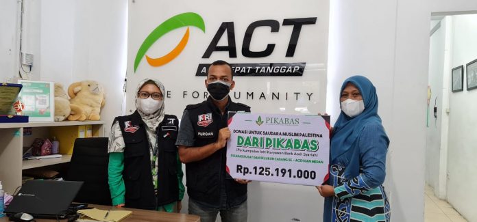 Analisaaceh.com, Banda Aceh | Perkumpulan Istri Karyawan Bank Aceh (PIKABAS) menyerahkan donasi untuk warga Palestina sebesar Rp. 125.191.000,-. Bantuan tersebut diserahkan langsung Ketua PIKABAS Ibu Cut Nurul Hayati kepada Kepala Cabang Aksi Cepat Tanggap (ACT) Aceh, Zulfurqan, Senin (31/05/2021) di Kantor ACT Aceh, Banda Aceh.