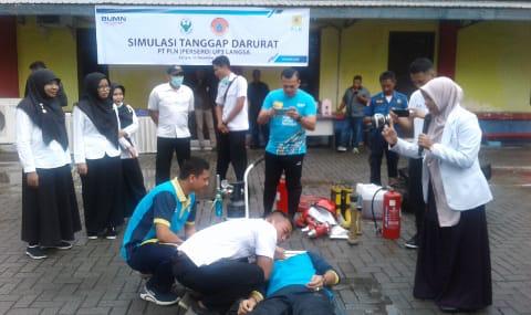 ANALISAACEH.COM, LANGSA | PT. PLN Persero UP3 Langsa bersama BPBD, Forum PRB, Damkar Kota Langsa, Puskesmas Langsa Lama dan Forum PRB Langsa melakukan Simulasi Bencana dan situasi kedaduratan di halaman kantor PLN Langsa, Senin, (16/12/2019).