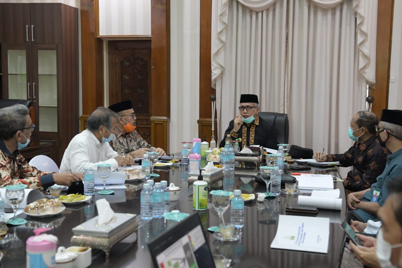 Analisaaceh.com, Banda Aceh | Pelaksana tugas Gubernur Aceh, Nova Iriansyah, memimpin rapat membahas prosedur operasional standar (POS) mekanisme proses pembelajaran tatap muka di sekolah dalam fase new normal di Pendopo Gubernur Aceh, Kamis (9/7/2020).