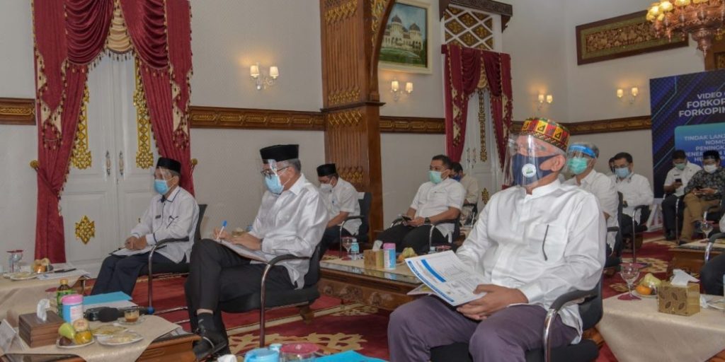 Plt Gubernur Aceh, Nova Iriansyah bersama Sekda Aceh, Taqwallah menggelar video conference dengan Forkopimda Aceh dan Forkopimda Kabupaten/Kota se- Aceh dalam rangka sinergitas penanganan covid-19 di Aceh dari Pendopo Gubernur Aceh, Banda Aceh, Jum'at (18/9/2020).