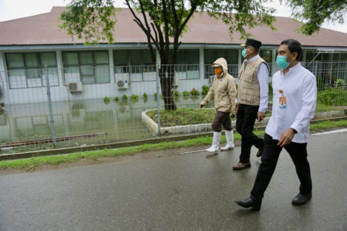 Analisaaceh.com, Banda Aceh | Pelaksana Tugas Gubernur Aceh, Nova Iriansyah, meninjau kondisi area ruang isolasi pinere yang tergenang air akibat hujan deras yang melanda kawasan Banda Aceh, di komplek Rumah Sakit Umum Zainoel Abidin (RSUZA) lama, Jum’at, (8/5/2020).