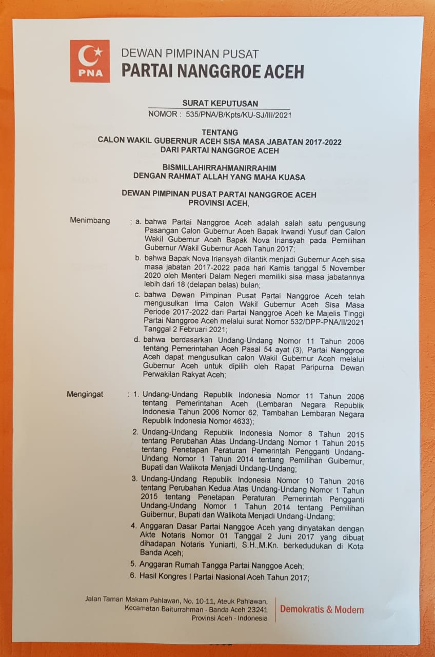 “Komunikasi antar Majelis Tinggi PNA sampai dengan awal Maret 2021 juga belum mencapai satu kesepakatan bulat untuk menentukan 1 (satu) orang Cawagub Aceh Sisa Masa Periode 2017-2022 dari Partai Nanggroe Aceh” Tambah Miswar.
