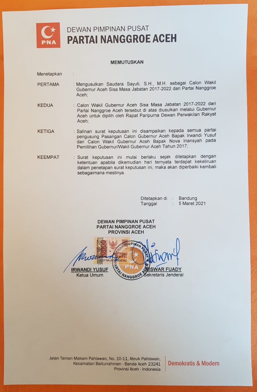 Analisaaceh.com, Banda Aceh | Dewan Pimpinan Pusat (DPP) Partai Nanggroe Aceh (PNA) secara resmi telah menetapkan satu nama Sayuti S.H.,M.H sebagai Wakil Gubernur Aceh sisa masa jabatan 2017-2022.