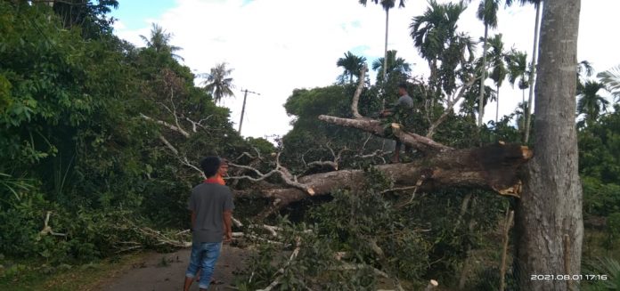 Analisaaceh.com, Jantho | Pohon tumbang di atas badan jalan Gampong Bayu, Kecamatan Seulimeum, Aceh Besar mengakibatkan akses transportasi masyarakat di wilayah setempat terhambat.