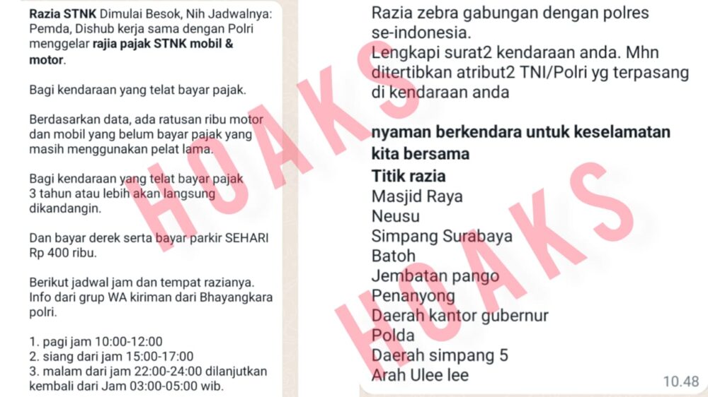 “Pesan WAG terkait jadwal dan lokasi razia STNK itu adalah hoaks. Saat ini Polda Aceh dan Polres jajaran yang tergabung dalam Operasi Mantap Brata Seulawah 2023-2024 fokus pada razia cipta kondisi dalam rangka mengamankan tahapan Pemilu 2024, kecuali ada hal-hal yang bersifat prinsipil” tegas Joko Krisdiyanto, Jumat (2/11/2023).