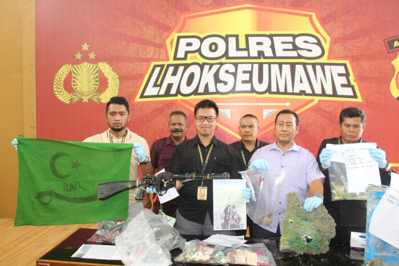 Konferensi Pers Polres Lhokseumawe terkait penyergapan AR alias Rahman Peudeng alias Rahman Teuntra, di Gampong Punteuet Kec. Sawang, Aceh Utara