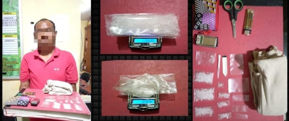 Bersama pelaku, petugas mengamankan barang bukti berupa tiga buah paket berukuran sabu dengan berat 16,60 gram, lima buah paket sabu berukuran kecil dengan berat 2,54 gram, satu buah timbangan digital kecil, dua buah sendok takar yang terbuat dari pipet plastik dan satu unit handphone Merk Nokia warna biru.