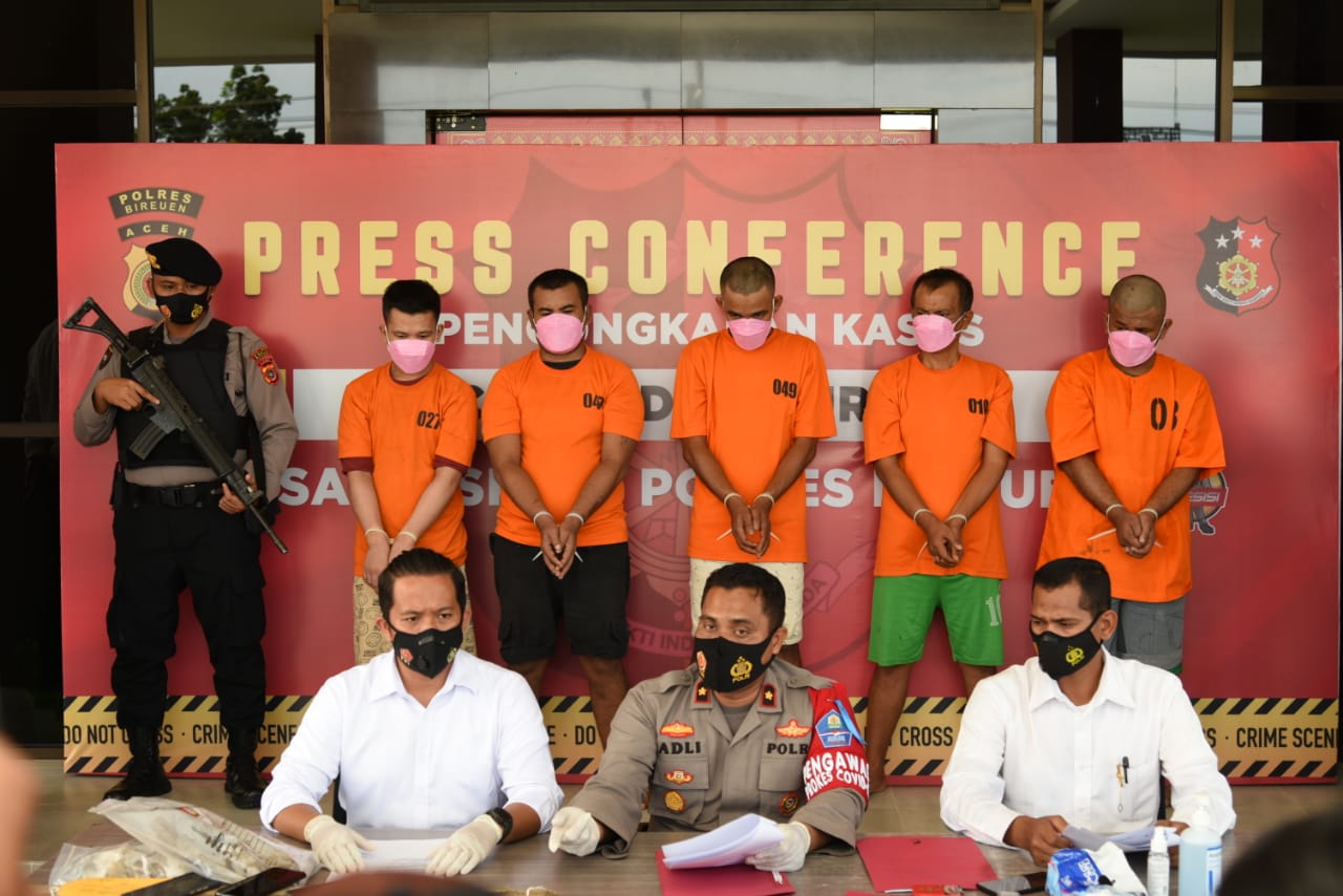 Kelima pelaku masing-masing ABR (29), FR (34) dan HZ (42) warga Kecamatan Kota Juang, Bireuen. Kemudian dua lainnya yakni PPS (19) dan AR (20) warga Langkat Sumatera Utara.