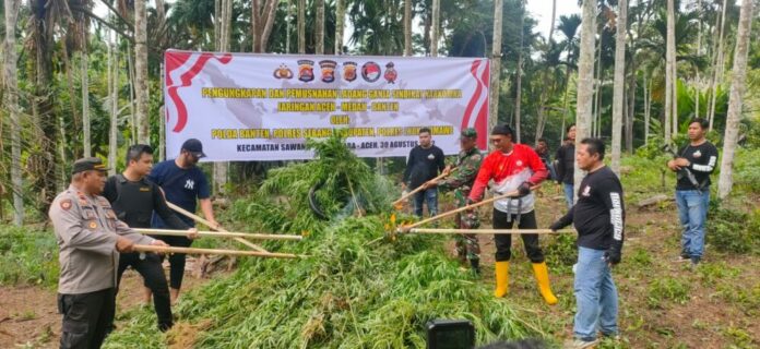 Analisaaceh.com, Lhokseumawe | Tim gabungan dari Polda Banten, Polres Lhokseumawe dan Polres Serang memusnahkan sebanyak 30 ribu batang ganja di atas lahan seluas 3 hektar di Dusun Cot Rawatu, Gampong Jurong, Kecamatan Sawang, Aceh Utara, wilayah hukum Polres Lhokseumawe, Selasa (30/8/2022).