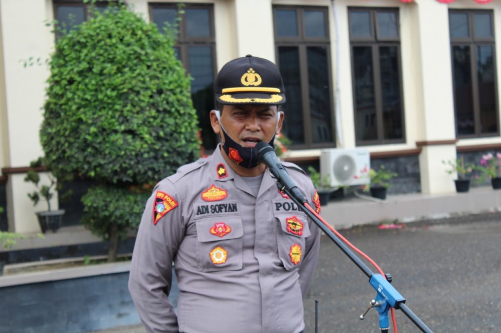 Kabag Ops Polres Lhokseumawe Kompol Adi Sofyan saat gelaran apel gabungan penegakan yustisi di halaman Mapolres , Senin (14/9/20)