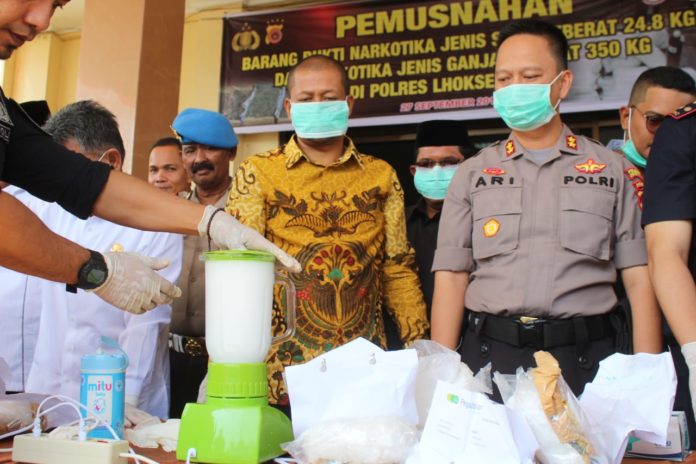 Analisaaceh.com, Lhokseumawe | Polisi Resor (Polres) Lhokseumawe menggelar pemusnahan terhadap barang bukti narkotika jenis sabu dan ganja hasil pengungkapan kasus dan penyerahan barang bukti hasil tangkapan bea cukai, Jum’at (27/09/2019) pagi.