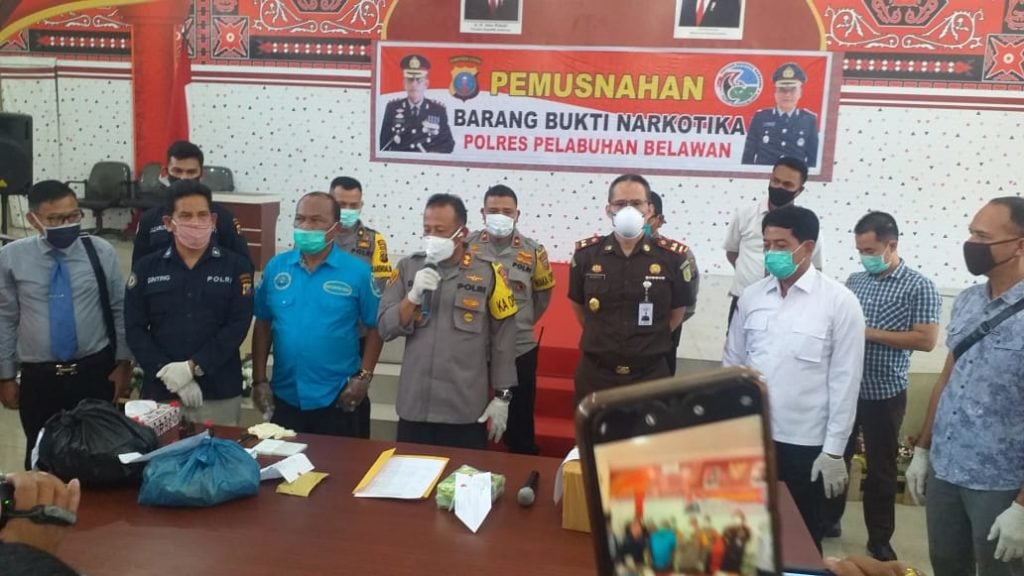 Analisaaceh.com, Medan | Polres Pelabuhan Belawan melakukan pemusnahan barang bukti narkoba di Aula Mako Polres Pelabuhan Belawan, Selasa (28/4/2020).