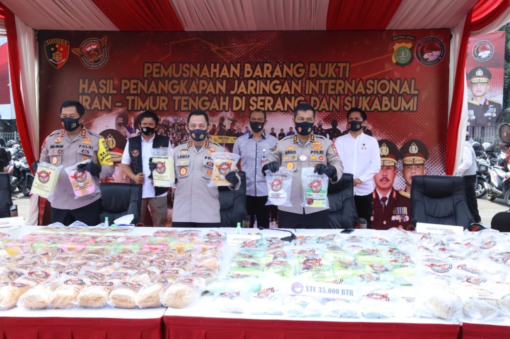 Analisaaceh.com | Bareskrim Polri memusnahkan 1,2 ton narkotika jenis sabu dan 35.000 ekstasi serta 410 ganja dari jaringan internasional Iran – Timur Tengah di Serang, Banten dan Sukabumi, Jawa Barat yang bertempat di Polda Metro Jaya, Kamis (02/07/2020).