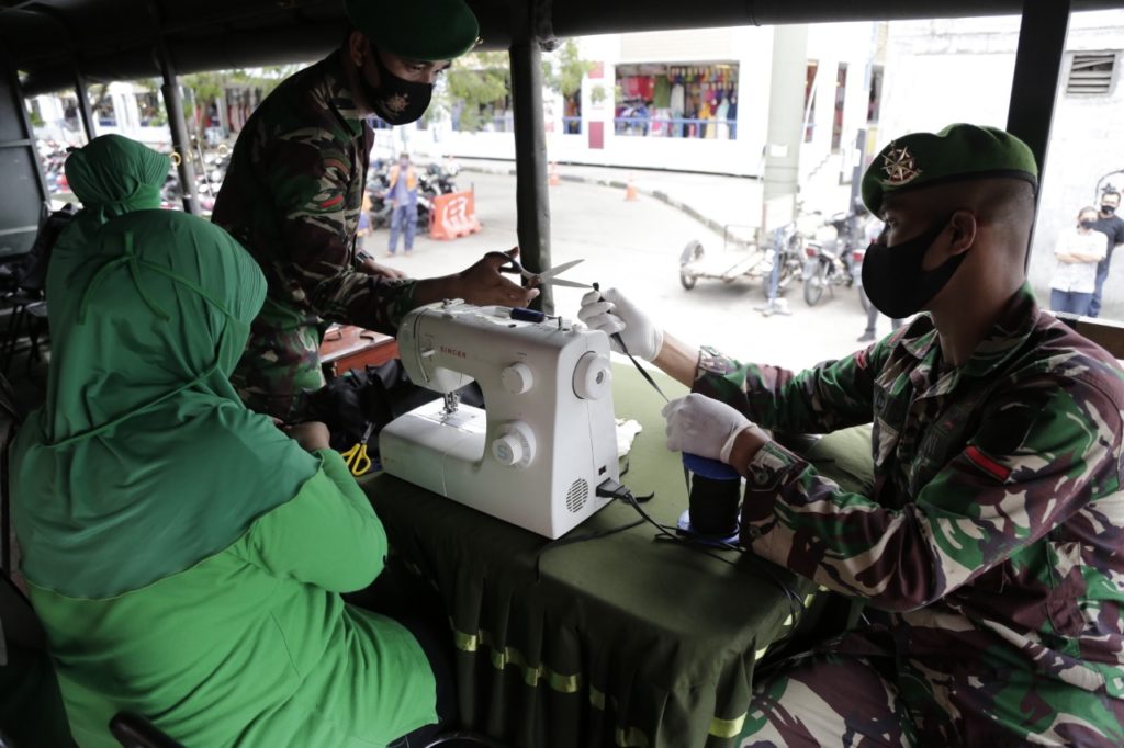 Uniknya, masker yang dibagikan itu merupakan hasil jahitan ibu Persit dibantu beberapa prajurit di lokasi pembagian masker.