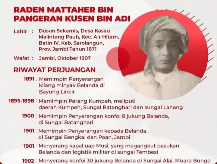 Raden Mattaher seorang panglima perang penuh talenta, cerdas, dan semangat. Ia berhasil memimpin perang 9 kali pertempuran melawan Belanda dan seluruhnya berhasil ia menangkan.