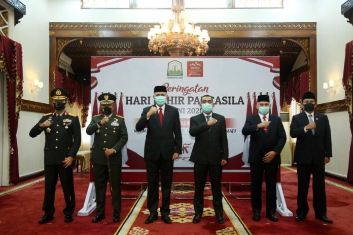Pelaksana Tugas Gubernur Aceh Nova Iriansyah bersama Ketua DPRA Dahlan Jamaluddin, Kapolda Aceh Irjen Pol Wahyu Widada, Pangdam Iskandar Muda Mayjend TNI Hasanuddin, Asisten Pembinaan Kajati Aceh Joko Wibisono dan Sekretaris Daerah Aceh Taqwallah, menghadiri peringatan Hari Lahir Pancasila via Video Conference, di ruang tengah Meuligoe Gubernur Aceh, Senin (1/6/2020).