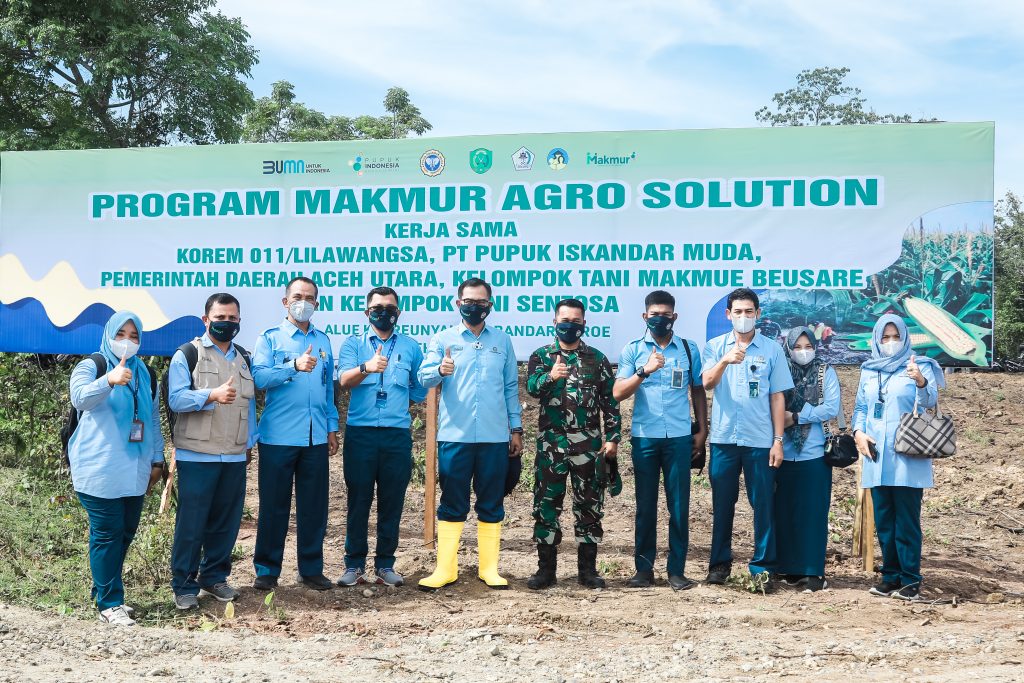Analisaaceh.com, Lhokseumawe — Program “MAKMUR” kepanjangan dari “Mari Kita Majukan Usaha Rakyat” merupakan program PT Pupuk Iskandar Muda (PIM) yang bersinergi dengan TNI Korem 011 Lilawangsa, Pemkab Aceh Utara dan Bank Syariah Indonesia (BSI) melaksanakan kegiatan tanam perdana komoditi jagung di Desa Alue Keureunyai, Kecamatan Banda Baroe, Kabupaten Aceh Utara, Provinsi Aceh, Rabu (13/10/21)