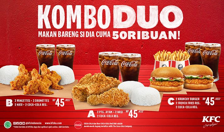 Mengutip situs kfcku.com (26/10/2021), promo KFC hari ini ialah Komboduo dengan harga 50 ribuan. Paket ini termasuk ayam goreng, nasi, dan minuman.