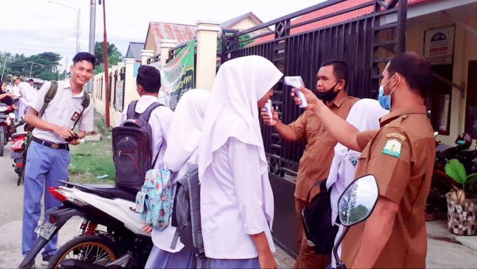 Dari pantauan analisaaceh.com di beberapa sekolah di Kecamatan Meureudu, terlihat pihak sekolah tetap menjalankan protokuler kesehatan kepada seluruh siswa dengan mengecek suhu badan dengan menggunakan thermo screaner (pengukur suhu tubuh) di pintu masuk sekolah, dan pihak sekolah juga menyediakan alat cuci tangan di setiap ruangan.