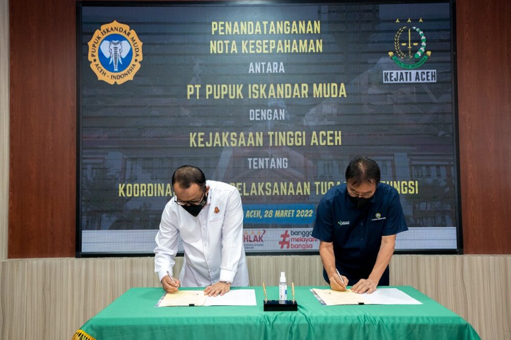 Analisaaceh.com, Lhoksukon | Direktur Utama PT Pupuk Iskandar Muda (PIM) dan Kepala Kejaksaan Tinggi (Kajati) Aceh, Bambang Bachtiar melakukan penandatanganan Nota Kesepahaman Bersama (MoU) terkait koordinasi tugas dan fungsi bertempat di Kantor Kejaksaan Tinggi Aceh di Banda Aceh, Senin (28/3/22).