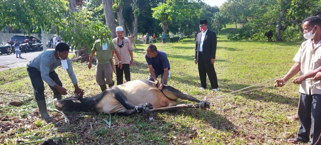 Dalam pelaksanaan penyembelihan hewan qurban panitia tetap menjaga protokol kesehatan COVID-19 dengan tetap menerapkan prinsip 5 M (Memakai masker, menjaga jarak, mencuci tangan pakai sabun, menghindari kerumunan dan menjaga mobilitas).