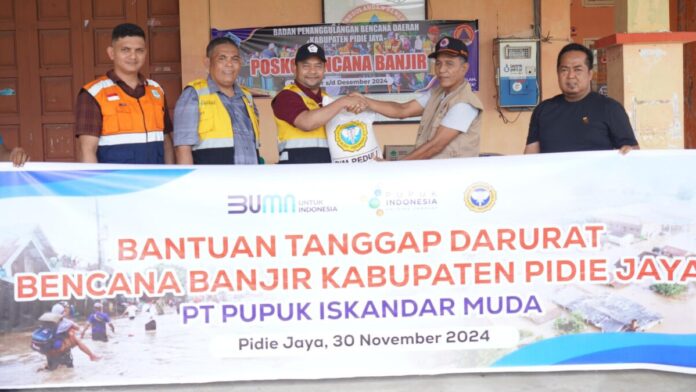 Analisaaceh.com, Pidie Jaya | PT Pupuk Iskandar Muda (PIM) menyalurkan bantuan tanggap darurat untuk masyarakat yang terdampak banjir di Kabupaten Pidie dan Pidie Jaya. Bantuan berupa kebutuhan pokok seperti beras, telur, minyak goreng, mi instan, susu anak, biskuit, air mineral, serta perlengkapan khusus untuk ibu dan anak.