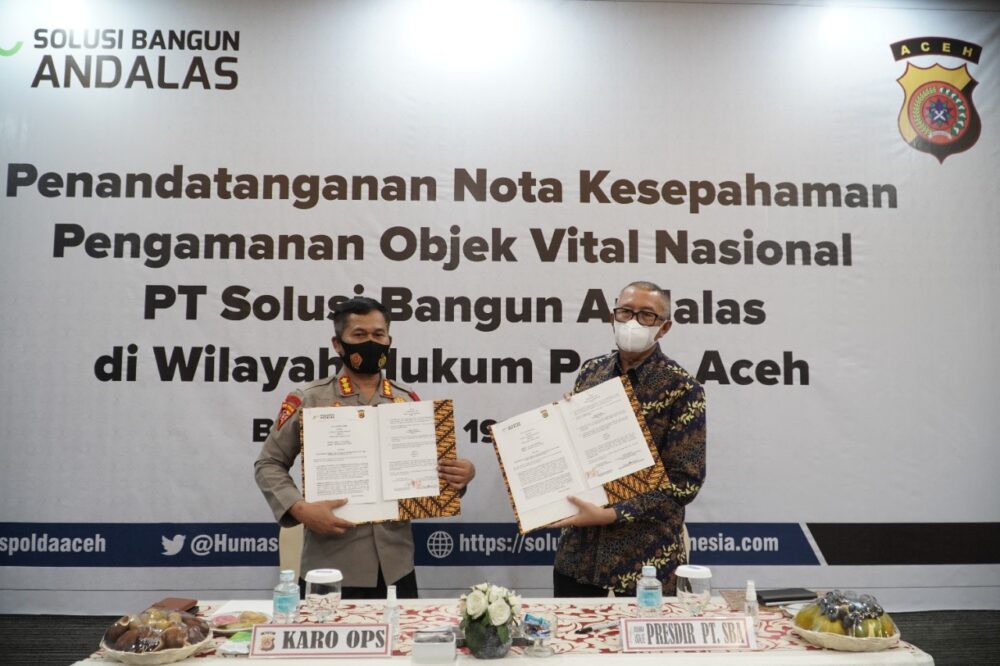 Analisaaceh.com, Banda Aceh | Dalam rangka memastikan operasional aman untuk jaminan ketersediaan pasokan, PT Solusi Bangun Andalas (SBA) menandatangani perjanjian kerja sama (Memorandum of Understanding [MoU]) dengan Kepolisian Daerah Aceh terkait pengamanan teknis operasional SBA sebagai Objek Vital Nasional (Obvitnas).