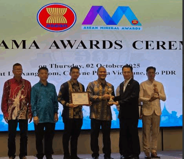 Menteri Industri & Perdagangan Laos PDR, H.E. Malaithong Kommasith menyerahkan penghargaan 1st Runner Up Asean Mineral Awards (AMA) 2025 kepada Quarry Manager PT Solusi Bangun Andalas, Adi Handarbeni di Laos pada 2 Oktober 2025.