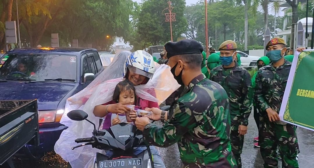 Analisaaceh.com, Lhokseumawe | Kegiatan sosial yang berupa pembagian takjil berbuka puasa dan masker, dilakukan dengan sangat antusias dan semangat untuk membantu masyarakat pengguna jalan di perempatan Taman Riyadhah Kota Lhokseumawe oleh Puluhan Prajurit dan Ibu Persit dari Yonkav 11/Macan Setia Cakti dan Denarhanud 001, pada Jumat, (8/5/2020).
