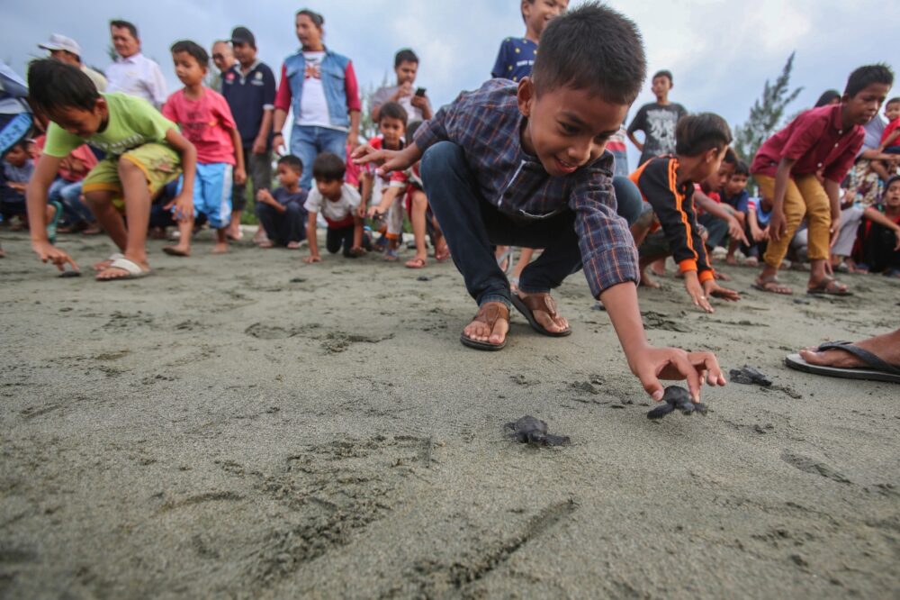 Pelepasan penyu di Pantai Islami, Peukan Bada, Aceh Besar pada Selasa (14/3/2023) foto : Naszadayuna/analisaaceh.com