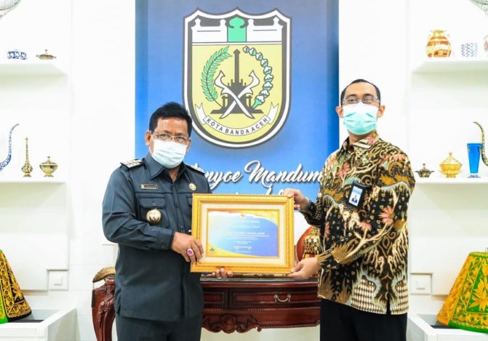 Penghargaan ini diserahkan oleh Kepala Kantor Direktorat Jenderal Perbendaharaan Provinsi Aceh, Safriadi SE MEc PhD di Pendopo Wali Kota,