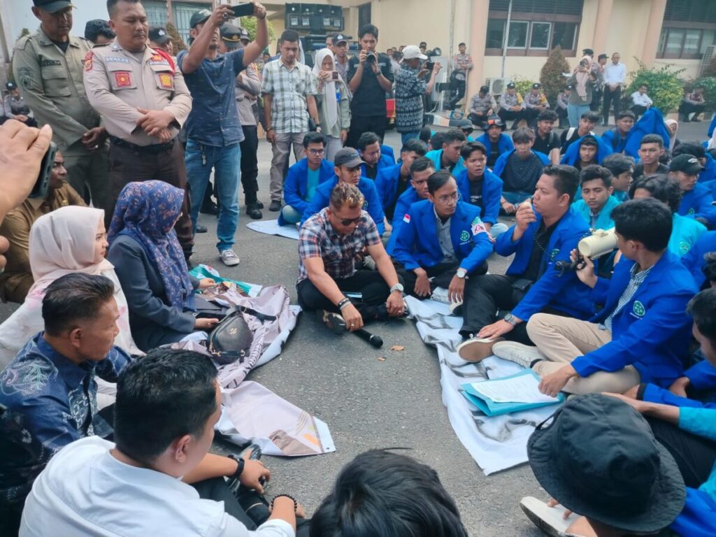 Aksi demontrasi oleh para mahasiswa Universitas Samudra Langsa di halaman kantor DPRK Langsa. Foto: Chairul/Analisaaceh.com.